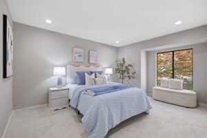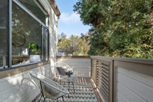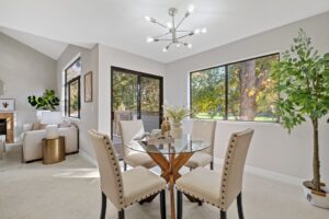 - The airy living room features a dramatic high ceiling and cozy fireplace, seamlessly flowing into the dining area and out to a lovely private patio overlooking the lush greenery of Townsend Park—perfect for morning coffee or evening relaxation.