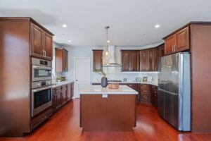 - The heart of the home boasts a beautiful, modern, and fully equipped kitchen with stainless steel appliances, abundant storage, and a roomy pantry for groceries. Bright living and dining areas are enhanced by recessed lighting and double-pane windows throughout, complemented by rich red mahogany hardwood flooring for warmth and easy maintenance.