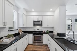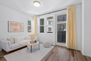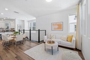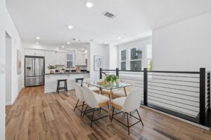 - Upstairs, the open-concept living and dining area flows seamlessly into a stylish kitchen featuring a sleek gas stove, spacious semi-island, & ample cabinetry. The primary suite offers a tranquil retreat complete with a walk-in closet & a dual-sink ensuite bathroom. Two additional bedrooms, an in-unit laundry area, and bonus storage on the balcony complete the upper level.