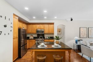 - The open-concept kitchen and dining area connects seamlessly to the living area and a large patio.