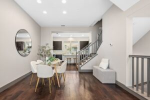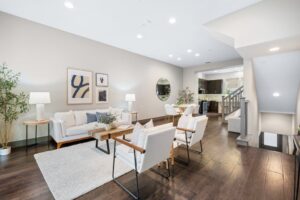 - The next level features an open living room flowing to the dining area and kitchen. Modern design continues with fully opening balcony doors from the living room, bringing in light, openness, and effortless indoor-outdoor living. High ceiling in living room.