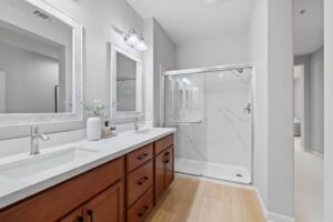 - A conveniently located bedroom and full bathroom on living room level offer a great option for visitors, a home office, or multi-generational living. Upstairs, you’ll find two expansive en-suite bedrooms, each designed for relaxation and privacy. remodeled the master shower. The primary suite impresses with a walk-in closet, a spacious bathroom with dual vanities and a remodeled shower.