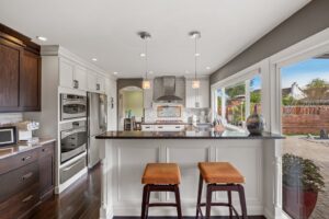 - The timeless kitchen boasts a large peninsula, over-the-cooktop pot filler, gourmet built-in appliances – double combo oven/microwave and warming drawer, counter-depth fridge, and ultra-quiet dishwasher. The beautiful designer Omega Cabinetry is complete with dovetailed solid wood drawers, tons of storage, granite countertops, and a coordinating butler pantry for extra storage and serving space. Extra-deep flat-bottom sink makes cleanups an ease.