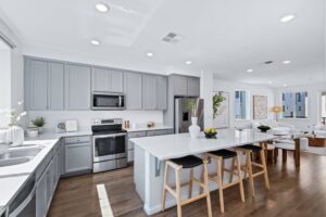 - Upstairs, the sun-soaked open-concept layout flows effortlessly from the bright living room to the stylish kitchen and outdoor patio. The kitchen is equipped with a large center island, stainless steel appliances, extensive cabinetry, and a walk-in pantry—ideal for both everyday cooking and entertaining.
