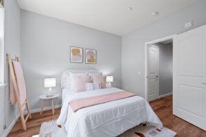 - The highly desirable layout includes a bedroom with a full bath on the living room level—ideal for guests or a home office. Upstairs, two spacious ensuite bedrooms await, and all bedrooms feature walk-in closets for exceptional storage. The spacious primary suite includes a dual-sink vanity, separated toilet room, and additional storage space.