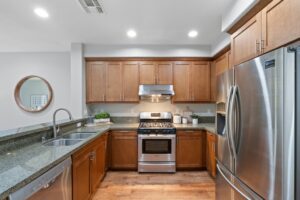 - The beautifully appointed kitchen features stainless steel appliances, abundant cabinetry, and a breakfast bar ideal for casual meals or entertaining.